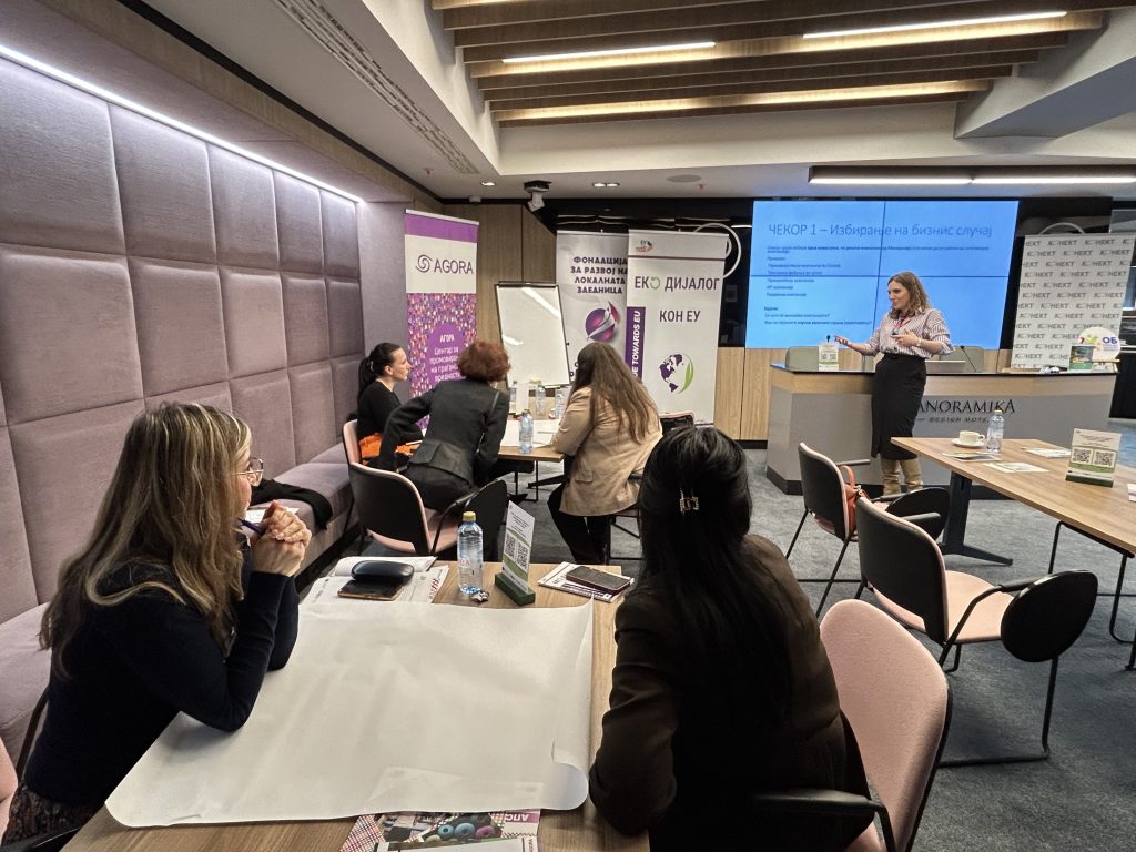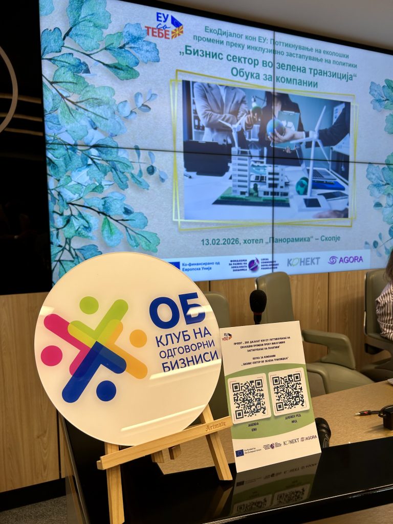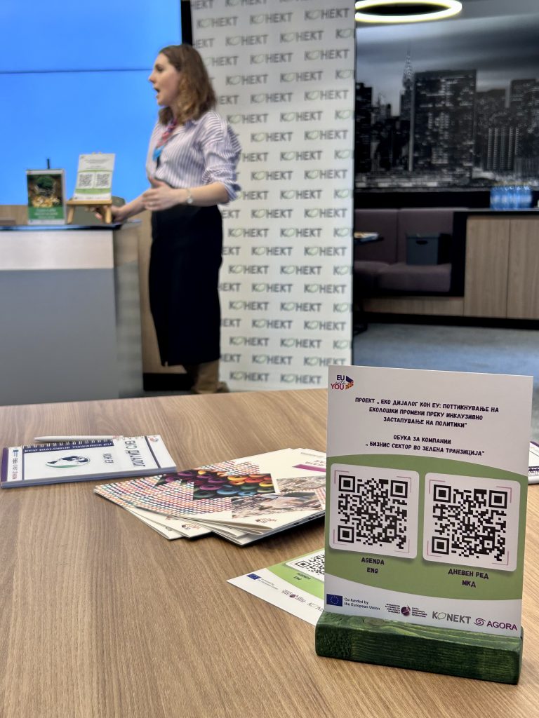 Обуката за компании „Бизнис сектор во зелена транзиција“ се спроведе во рамки на проектот „Еко дијалог кон ЕУ: Поттикнување на еколошки промени преку инклузивно застапување на политики“ е кофинансиран од Европската Унија и имплементиран од Фондацијата за развој на локалната заедница – Штип (ФРЛЗ) во партнерство со здружението „Конект“и здружение „АГОРА Центар за промовирање на граѓански вредности“ Скопје.